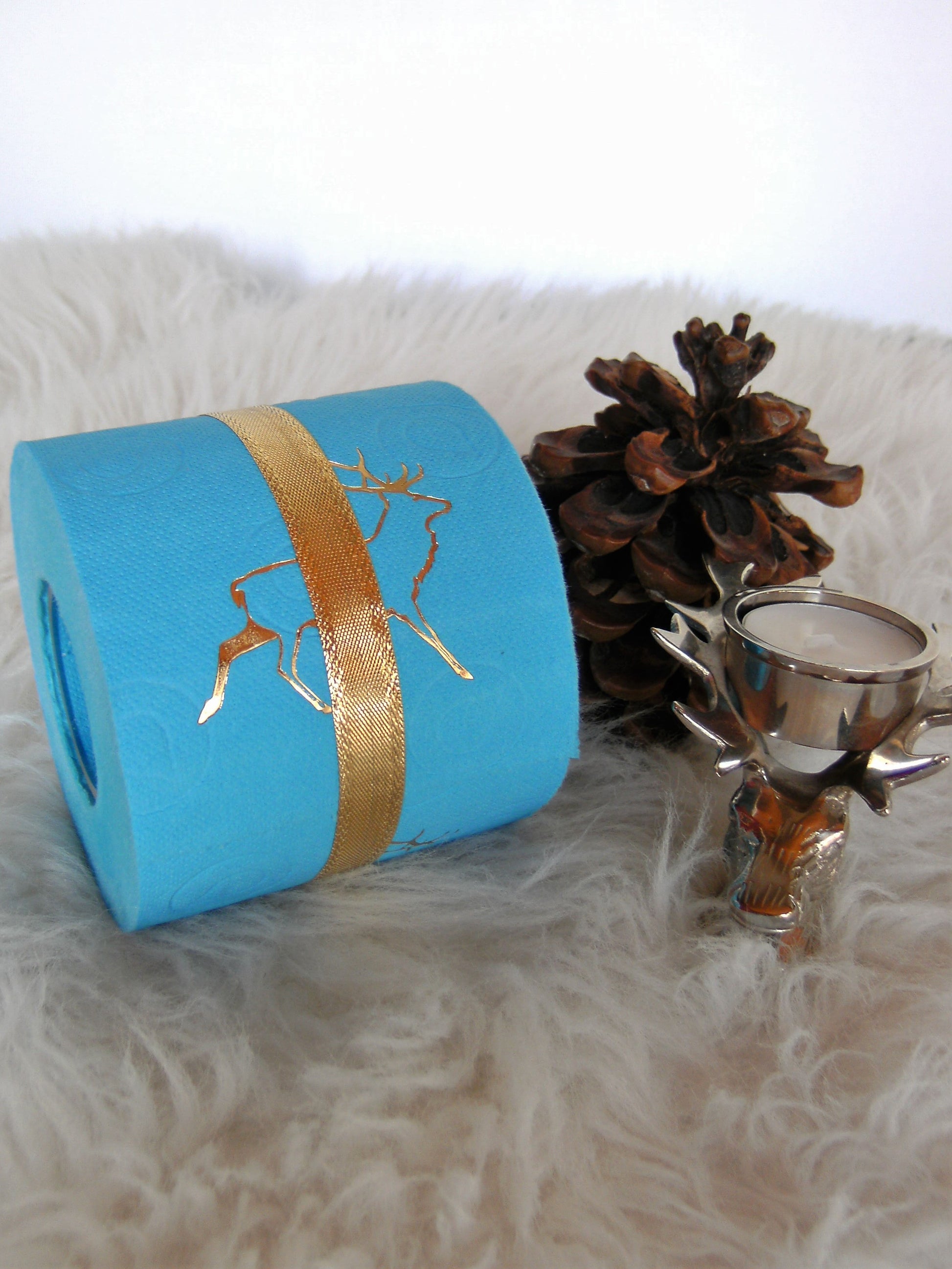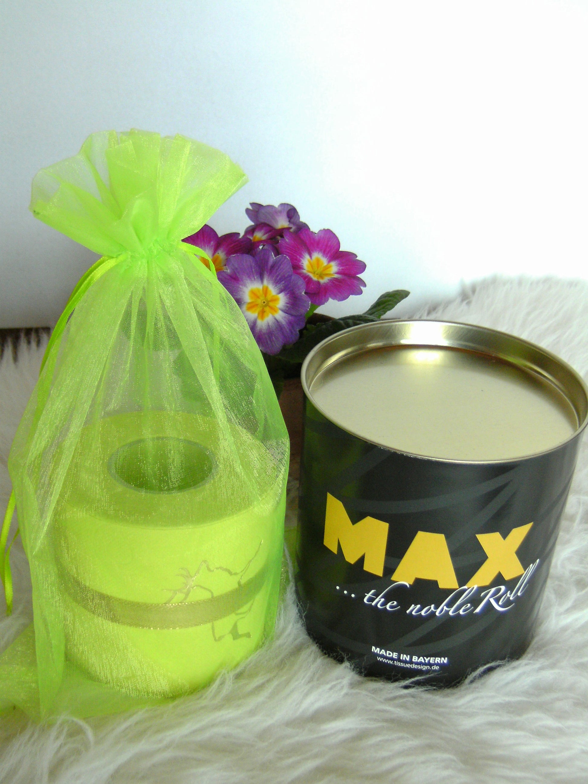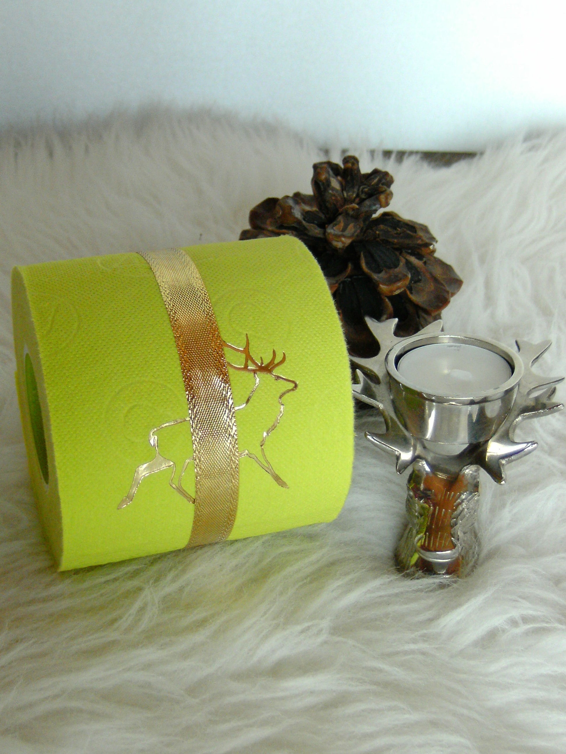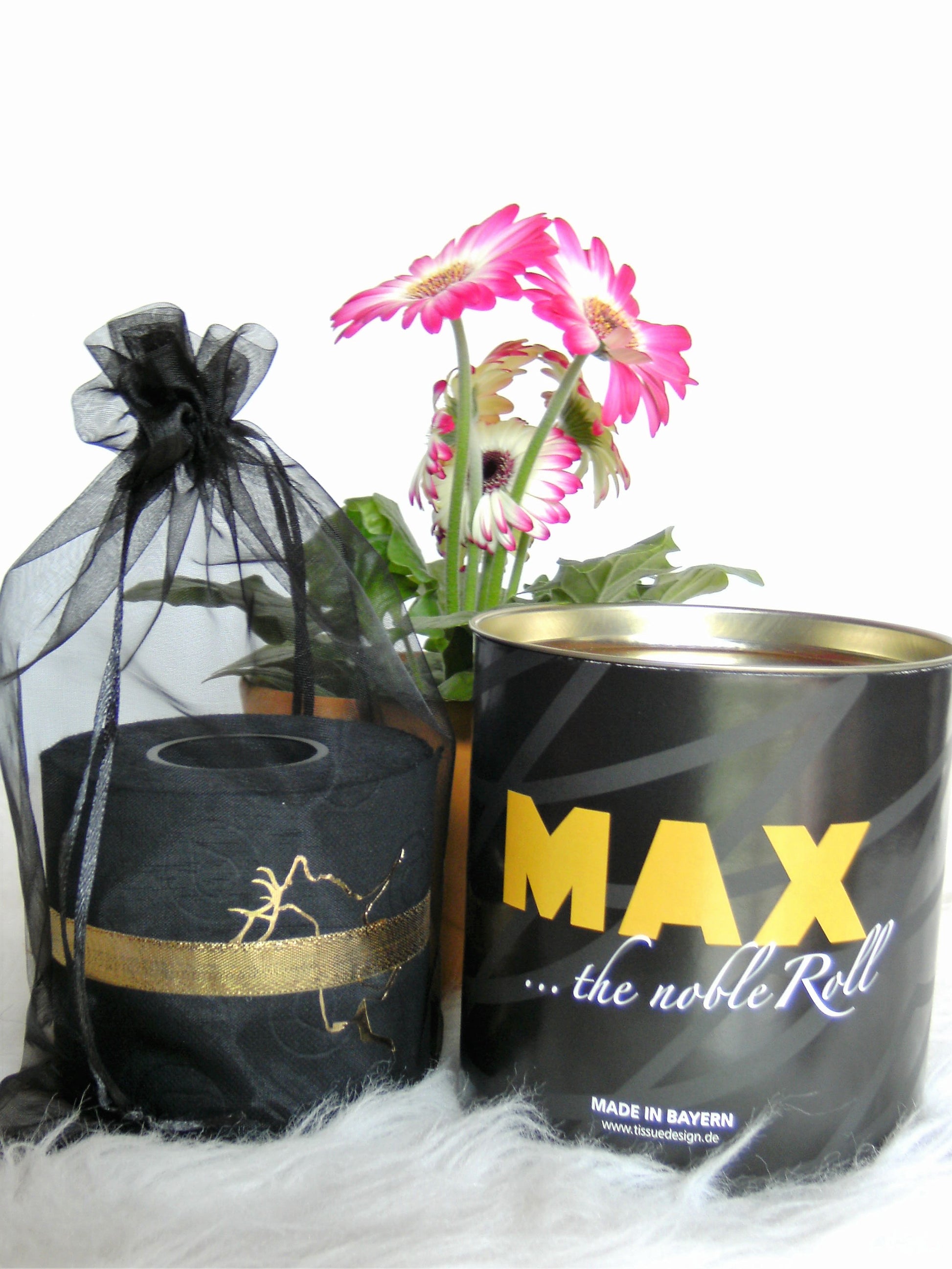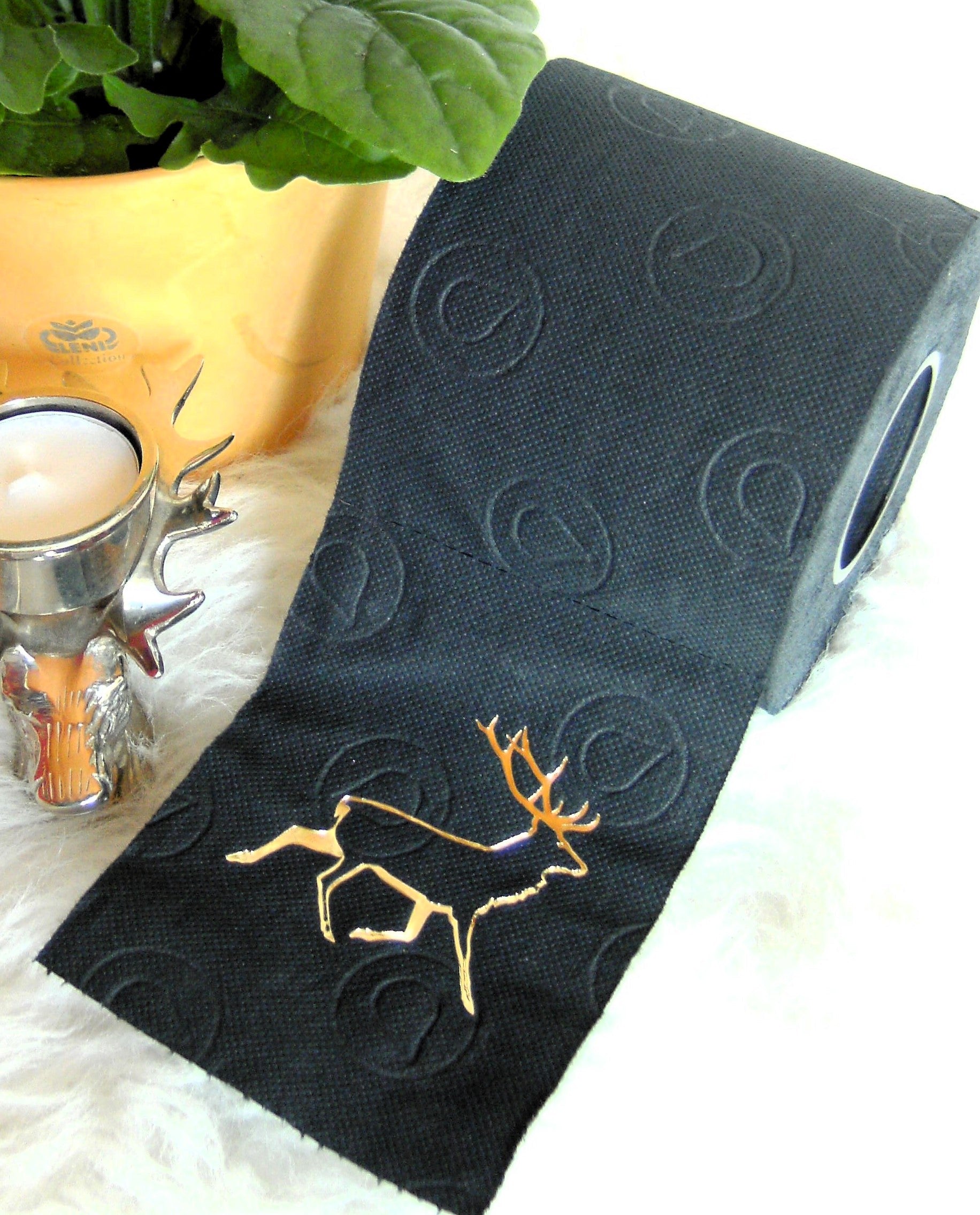 on colored toilet paper. The finely crafted embossing can be found on every second oneLeaf again. During the embossing process, the toilet roll is rolled directly onto an elegant plexiglass core instead of the cardboard core. The roll is then wrapped with a gold or silver ribbon and packed in an organza bag in a matching color. To protect the refined roll, it also comes with an attractive decorative box.