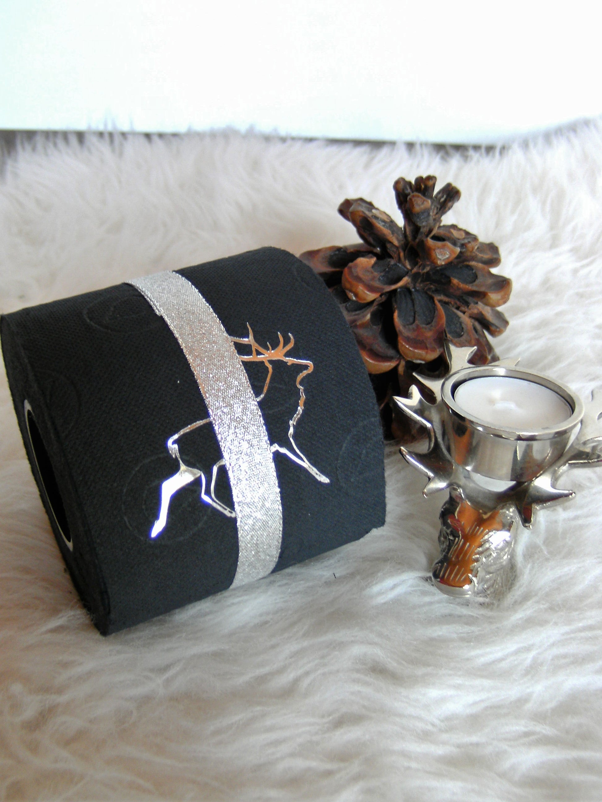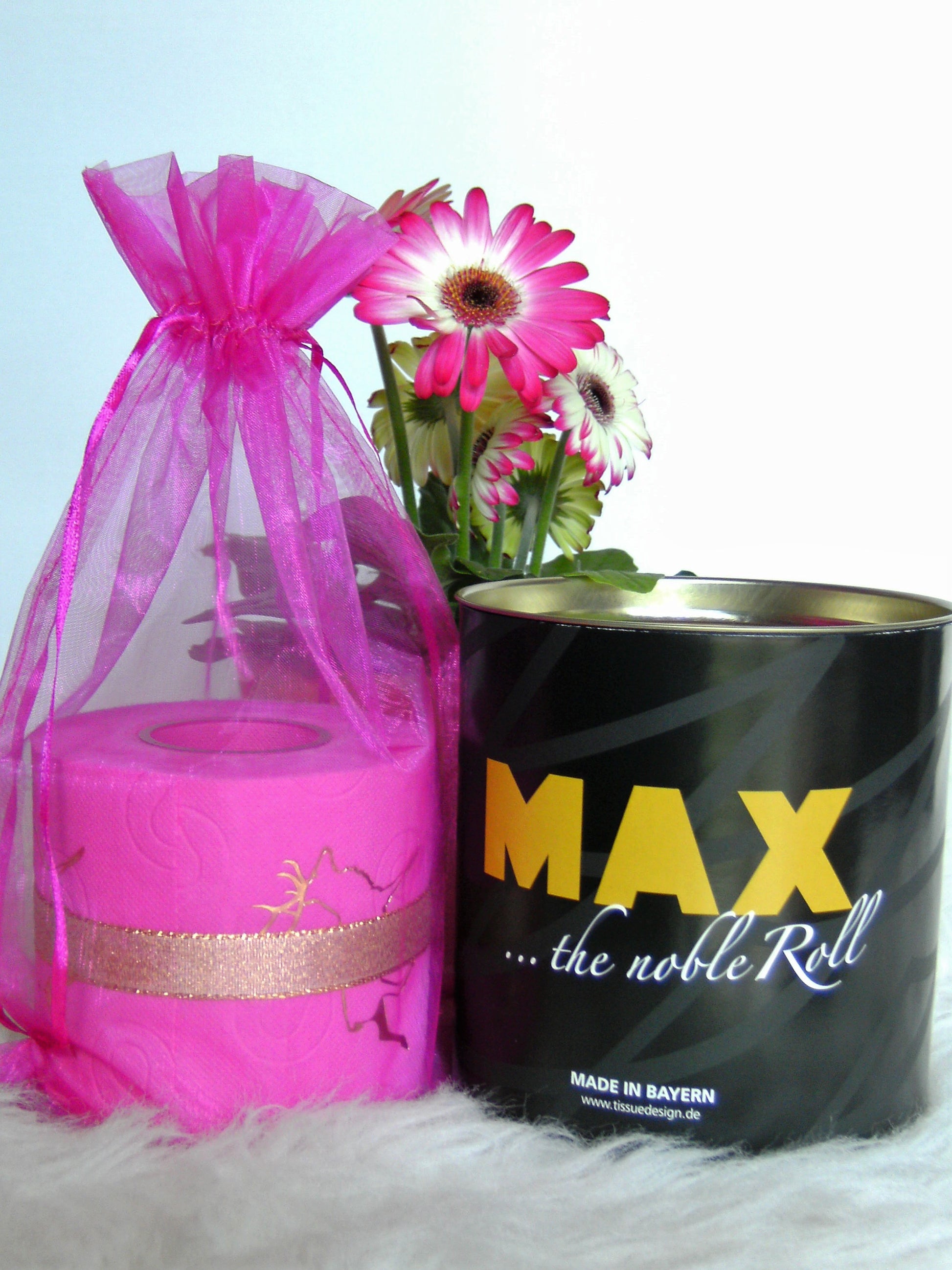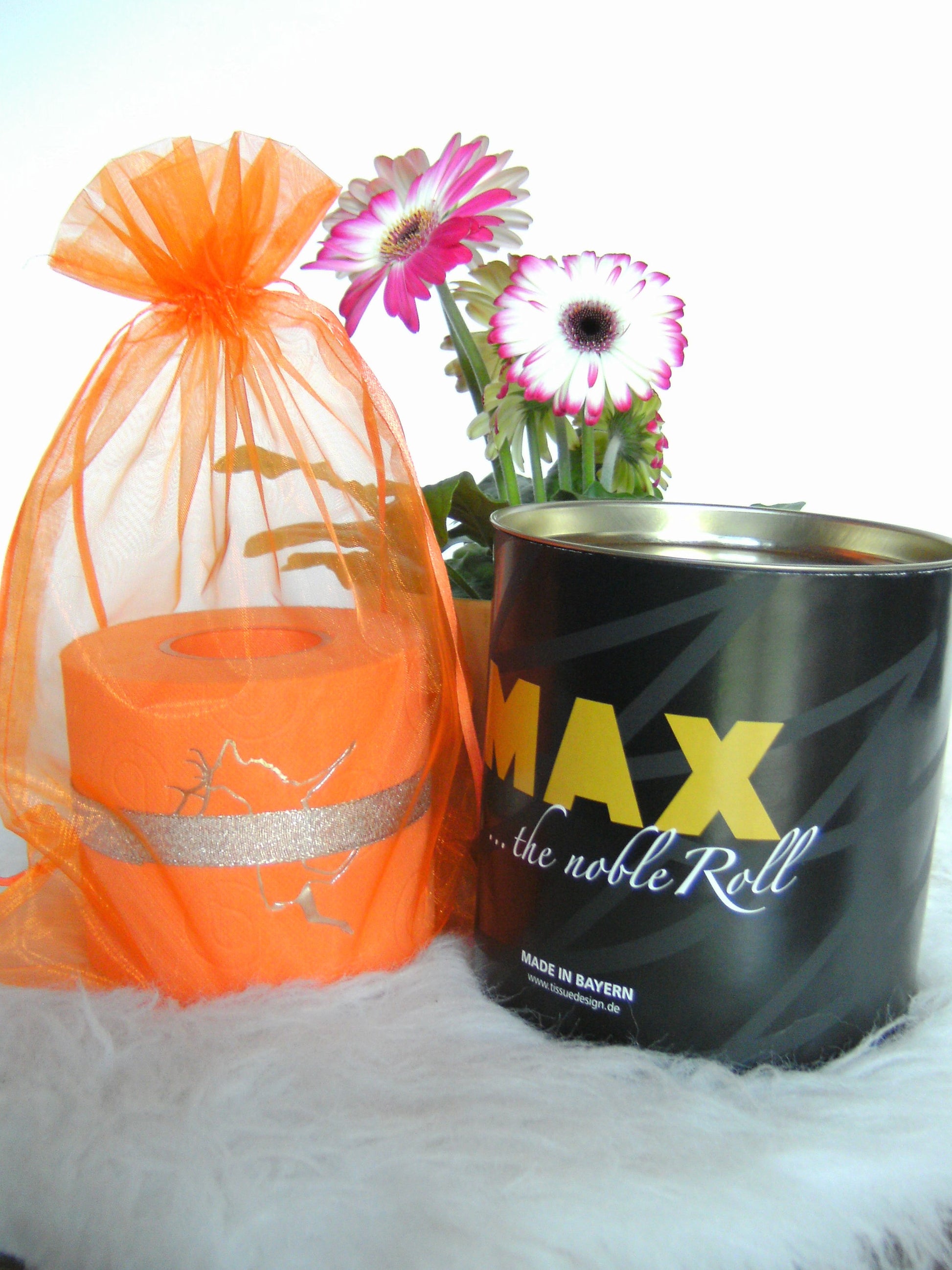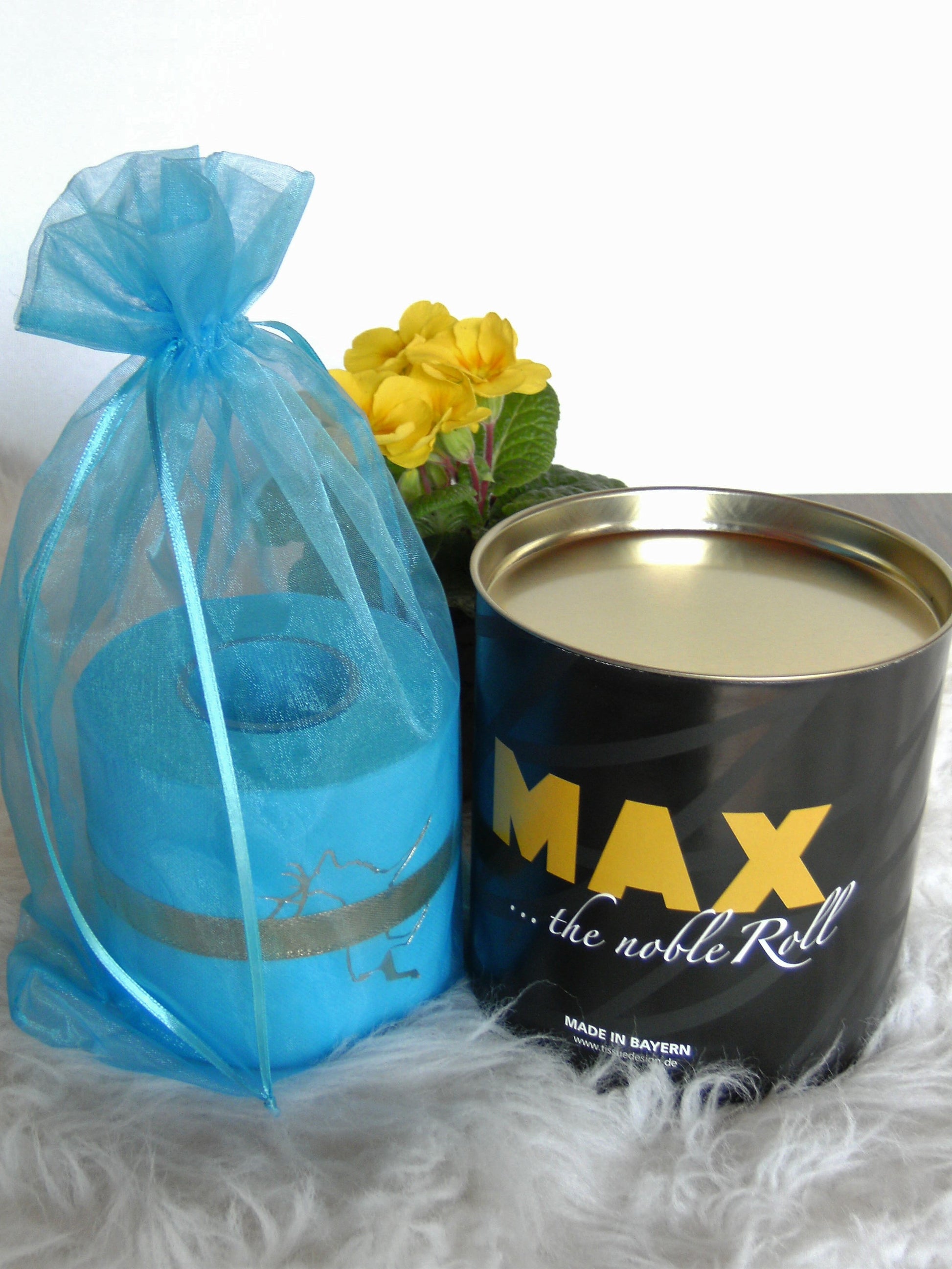 on colored toilet paper. The finely crafted embossing can be found on every second oneLeaf again. During the embossing process, the toilet roll is rolled directly onto an elegant plexiglass core instead of the cardboard core. The roll is then wrapped with a gold or silver ribbon and packed in an organza bag in a matching color. To protect the refined roll, it also comes with an attractive decorative box.