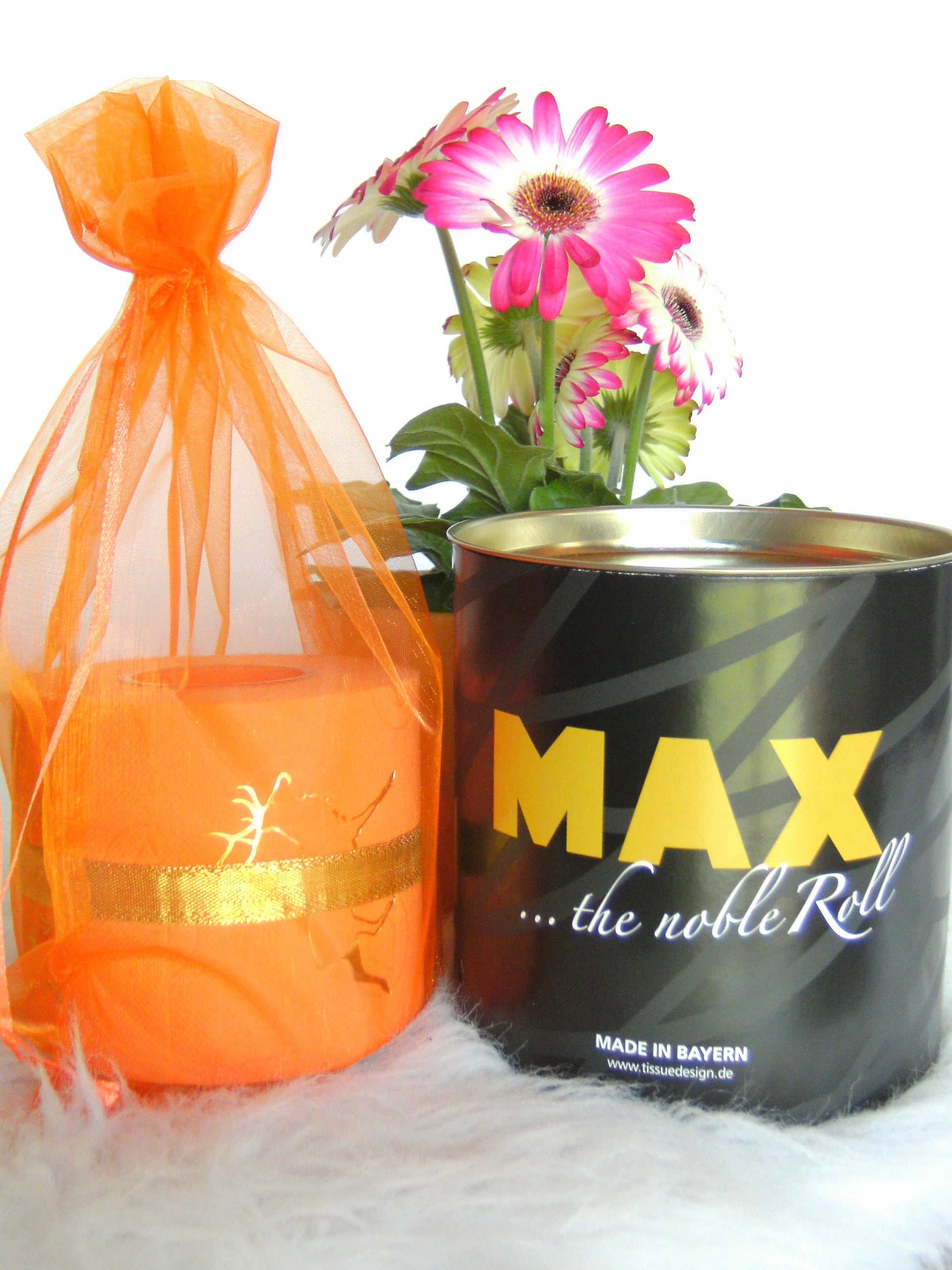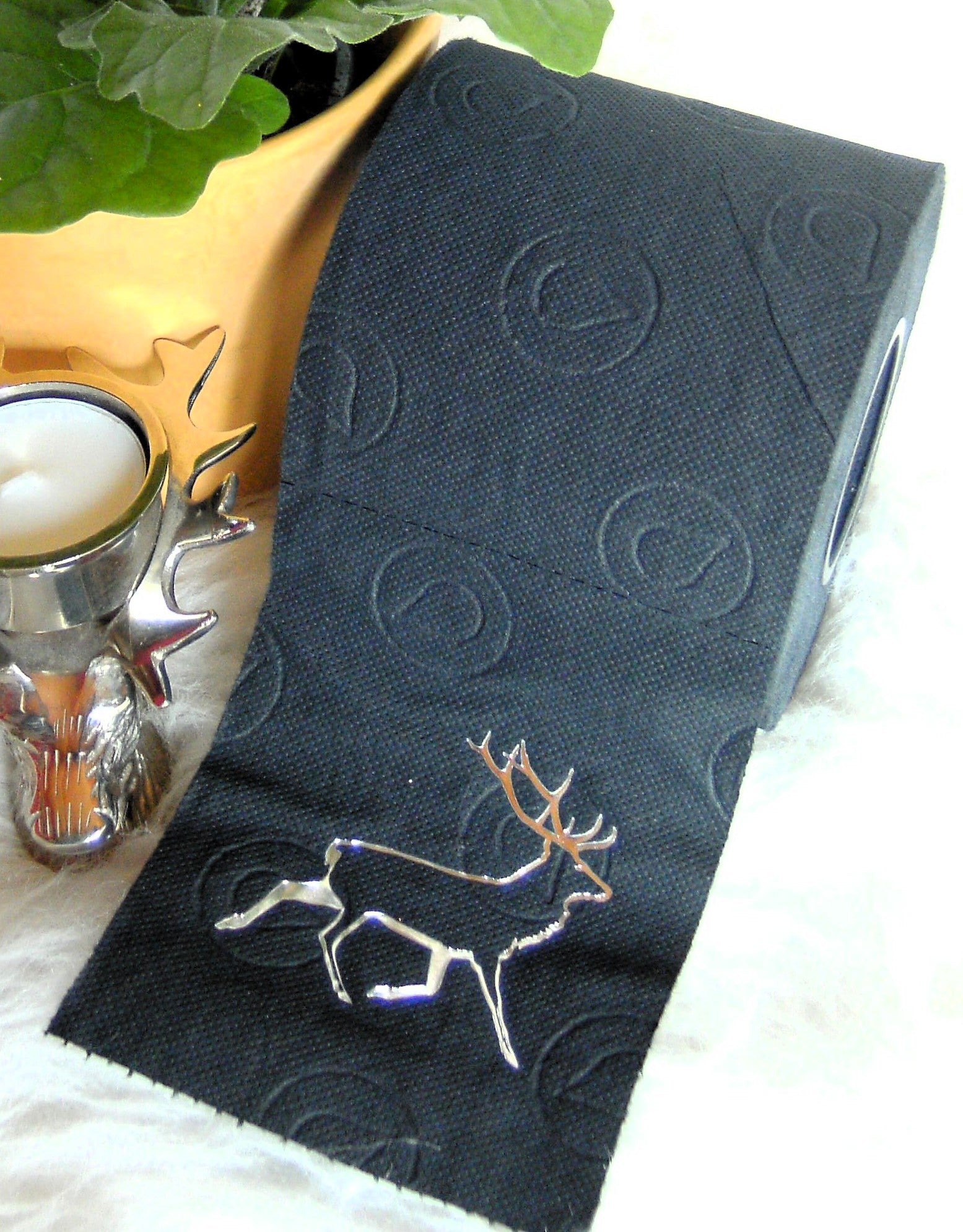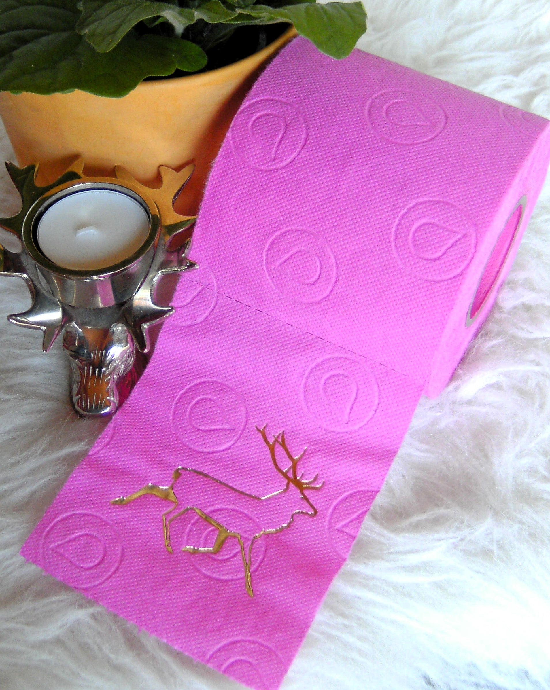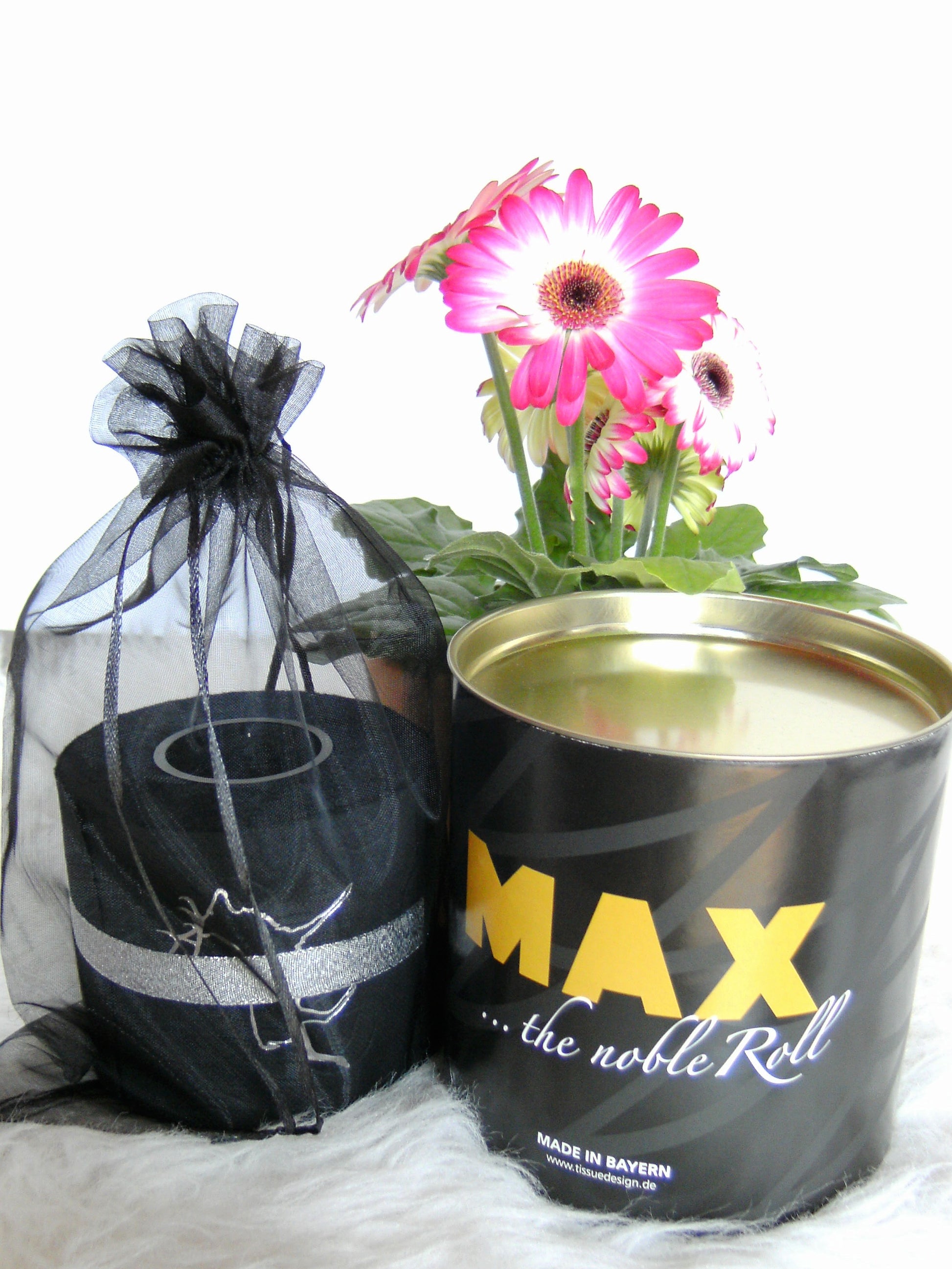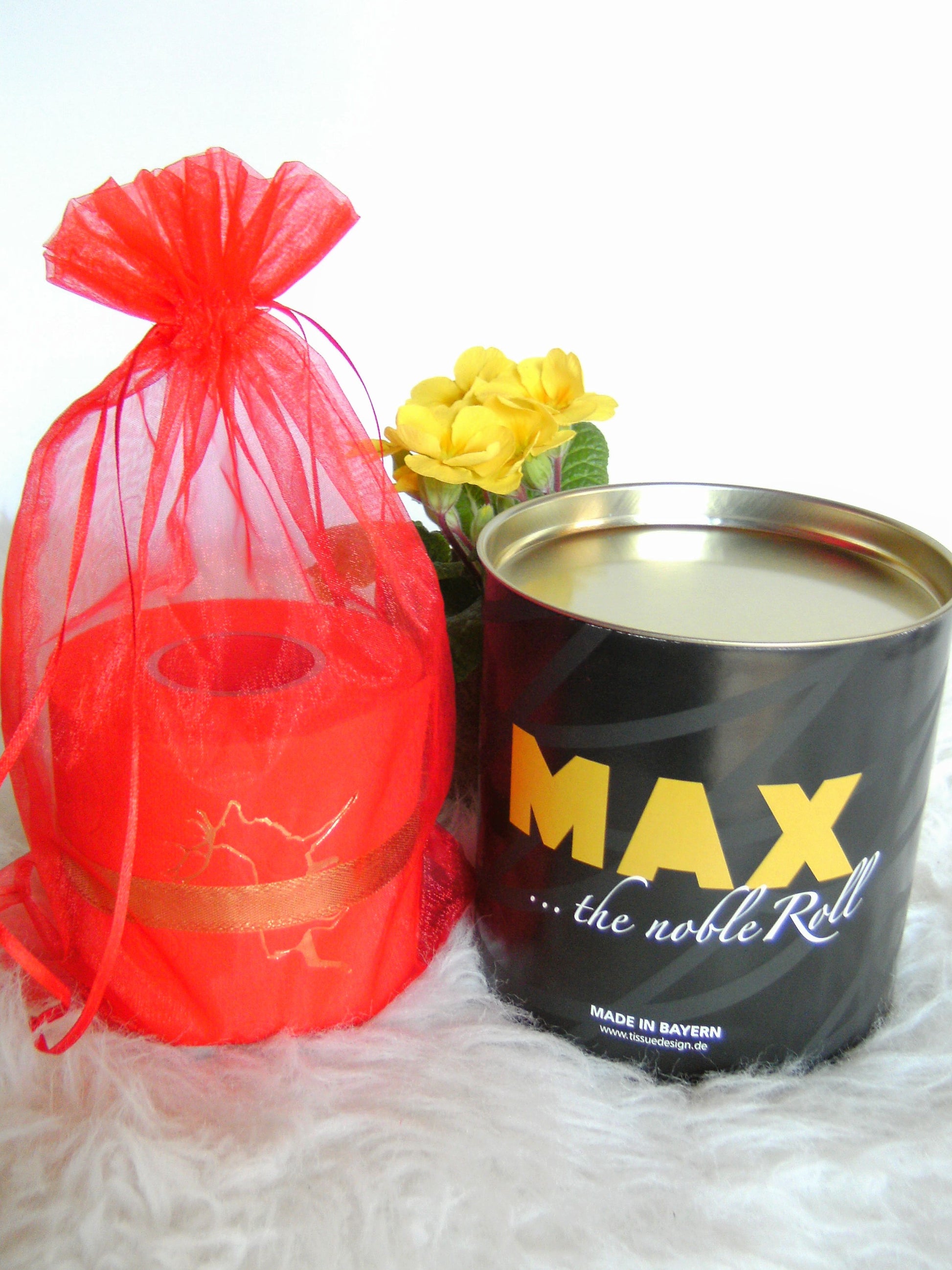 on colored toilet paper. The finely crafted embossing can be found on every second oneLeaf again. During the embossing process, the toilet roll is rolled directly onto an elegant plexiglass core instead of the cardboard core. The roll is then wrapped with a gold or silver ribbon and packed in an organza bag in a matching color. To protect the refined roll, it also comes with an attractive decorative box.