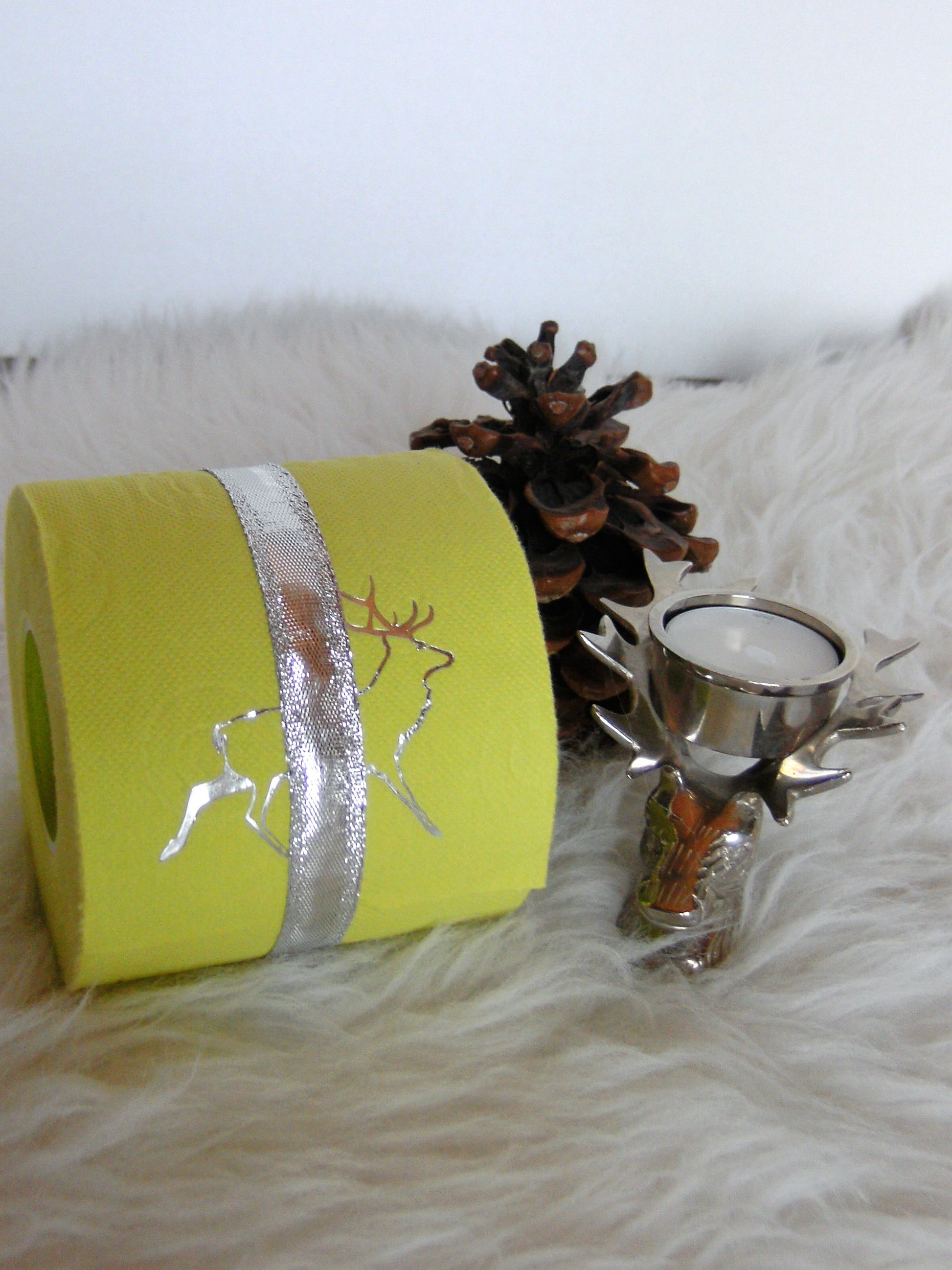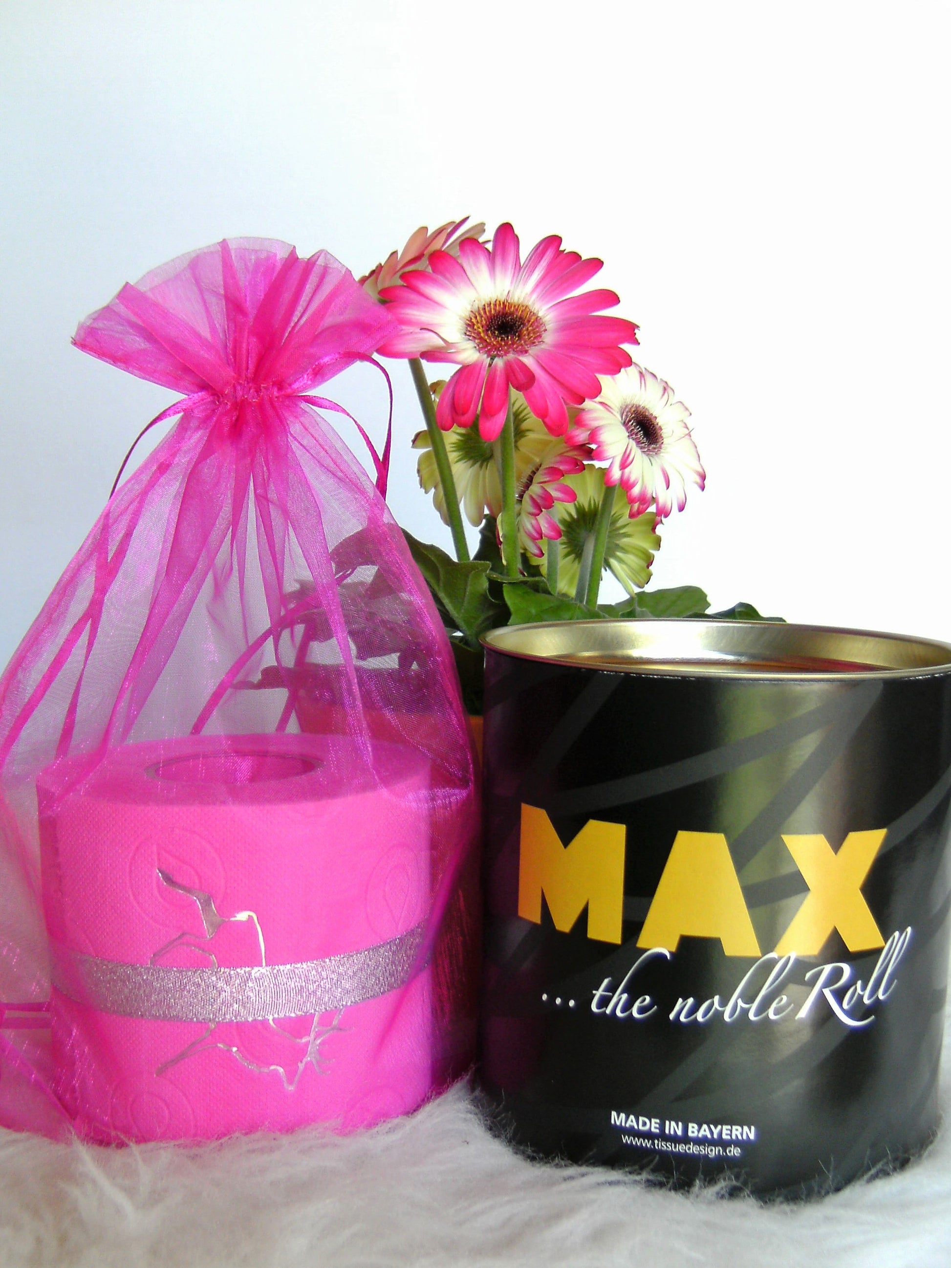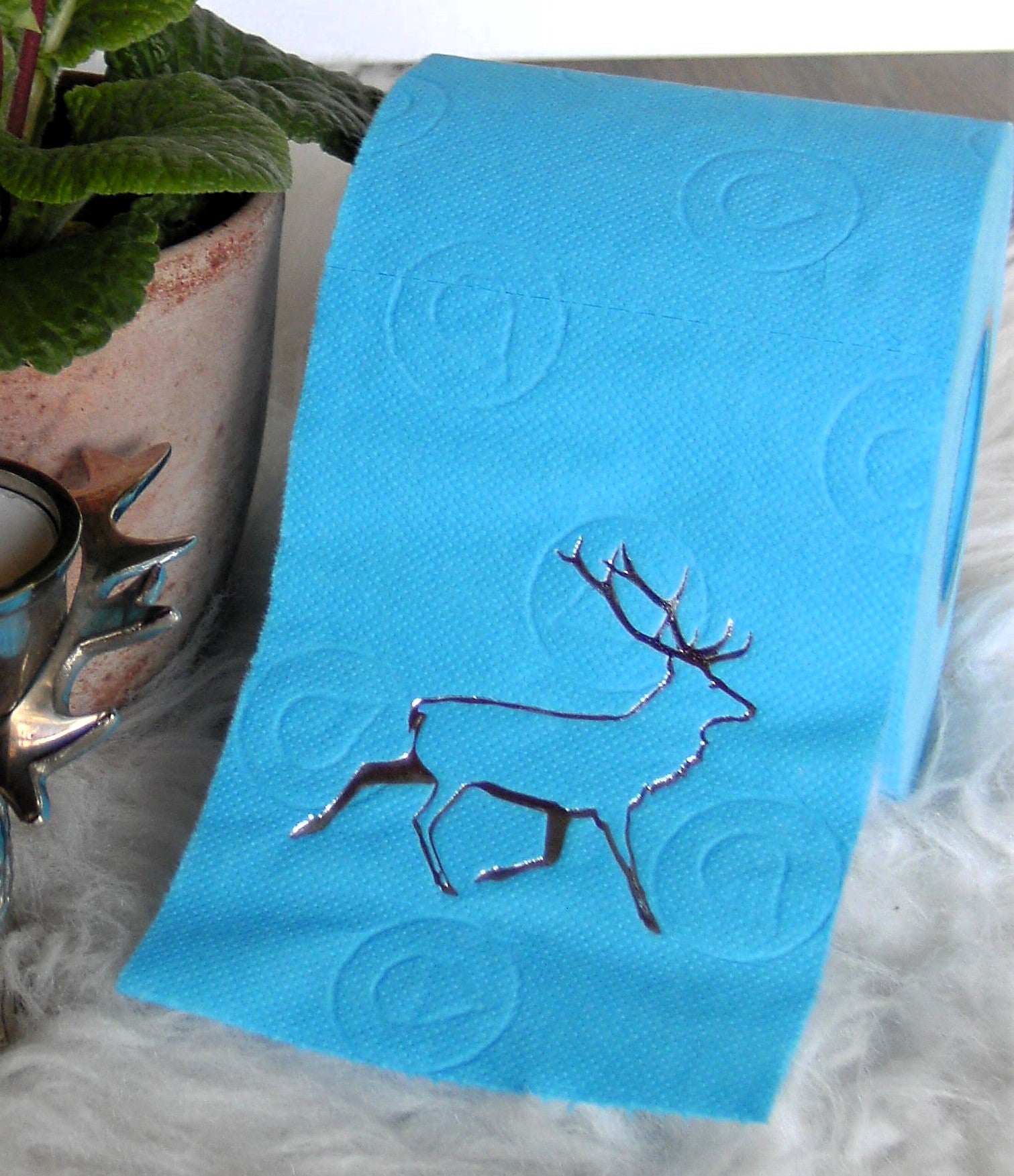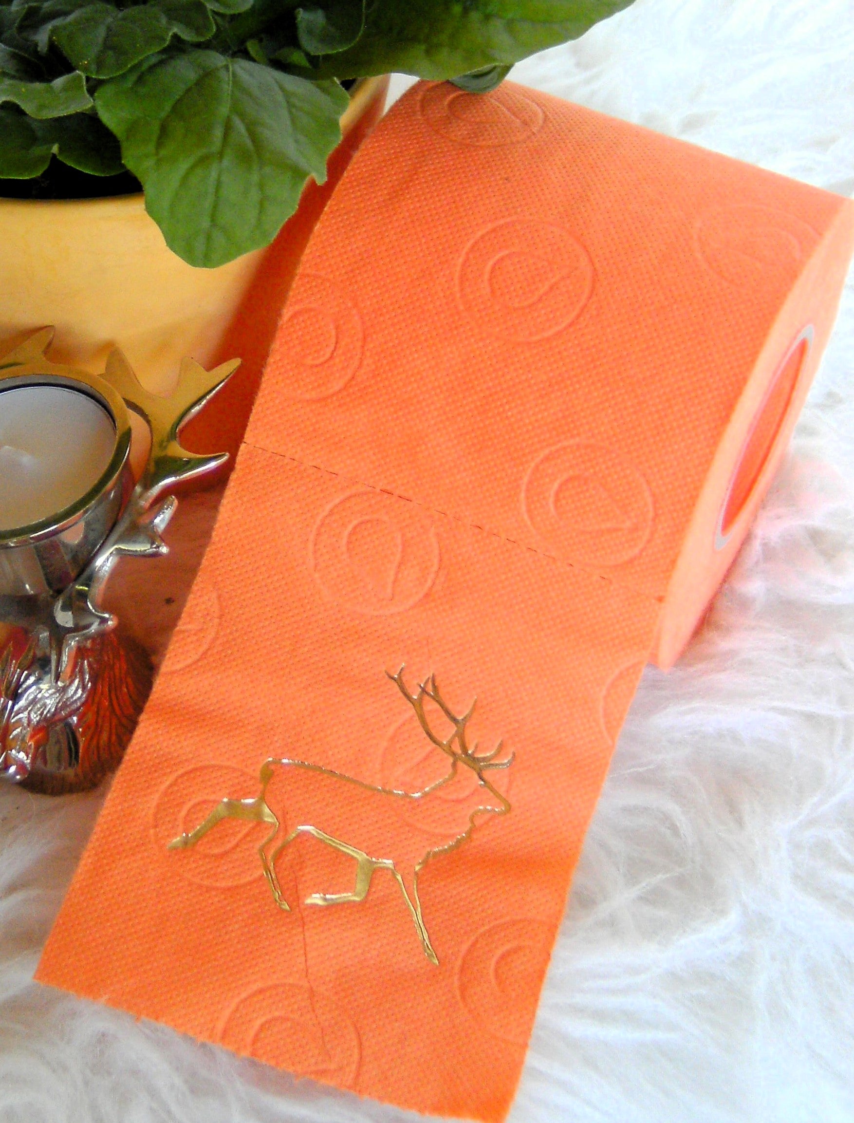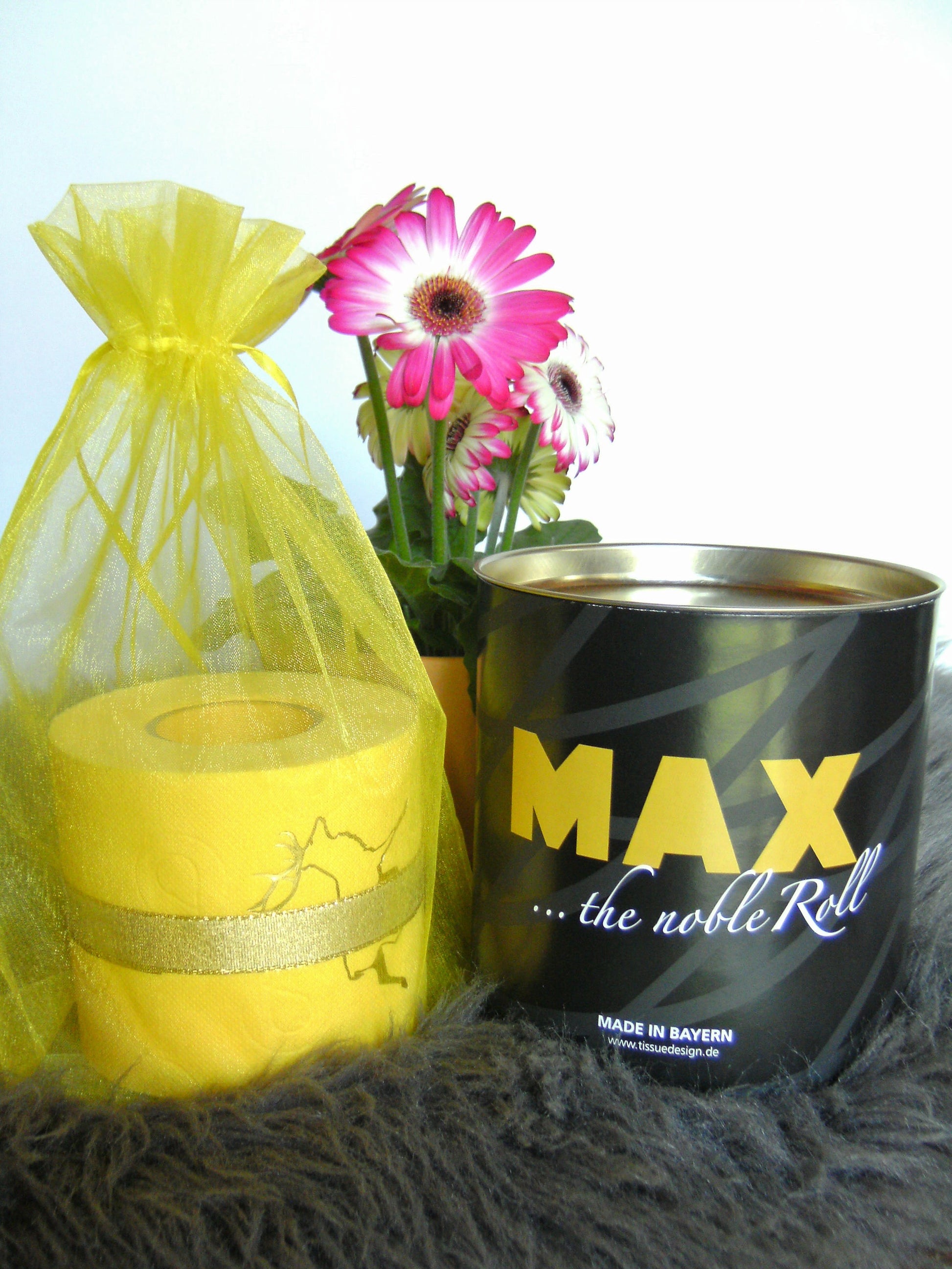 on colored toilet paper. The finely crafted embossing can be found on every second oneLeaf again. During the embossing process, the toilet roll is rolled directly onto an elegant plexiglass core instead of the cardboard core. The roll is then wrapped with a gold or silver ribbon and packed in an organza bag in a matching color. To protect the refined roll, it also comes with an attractive decorative box.