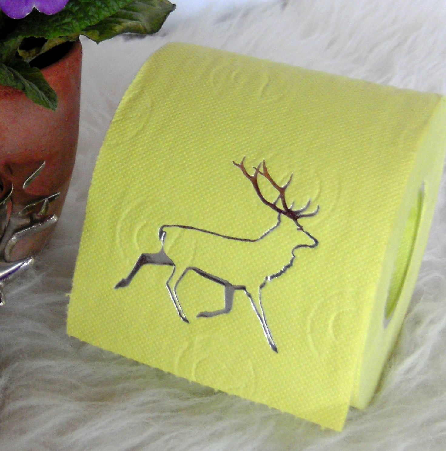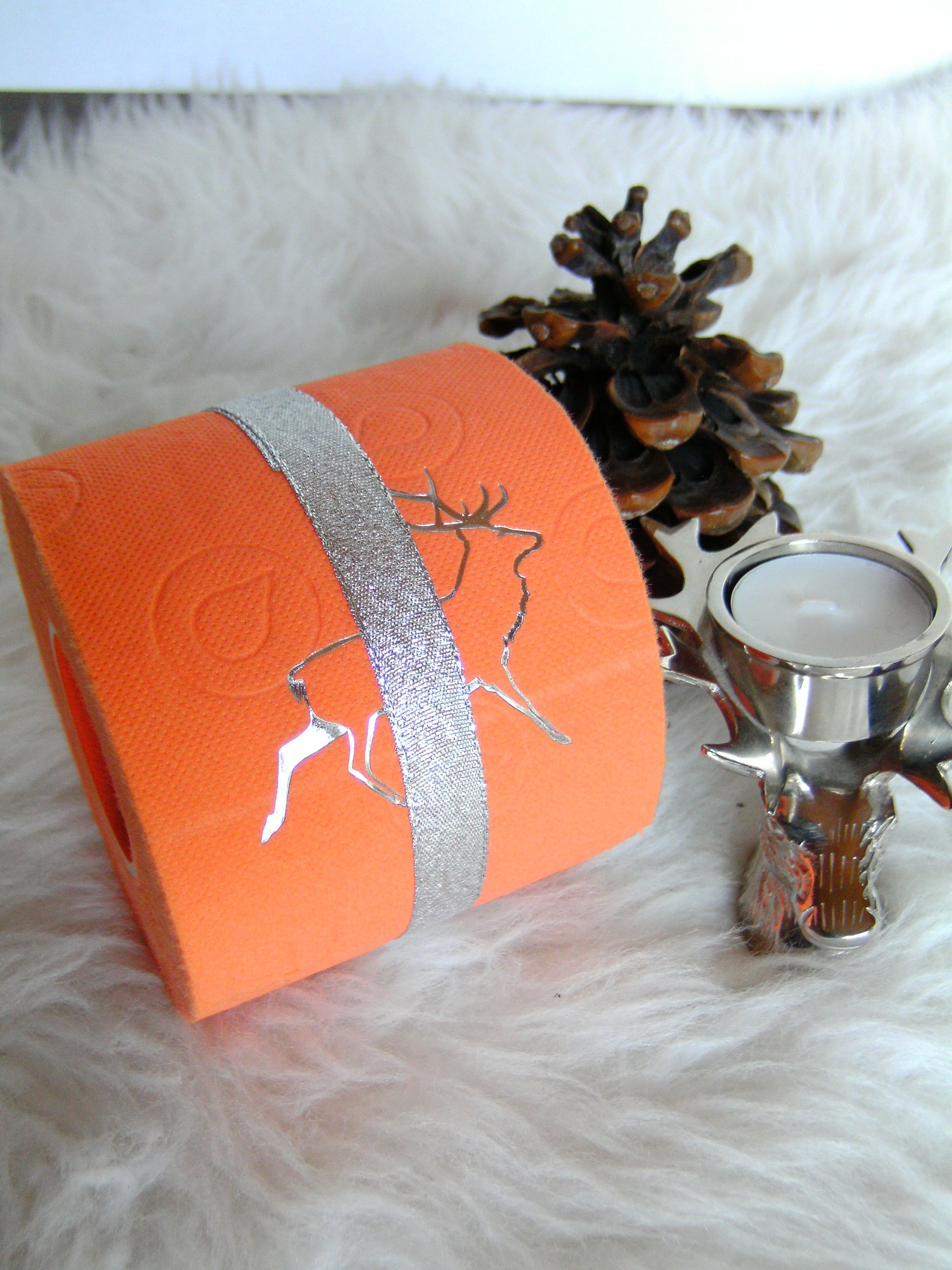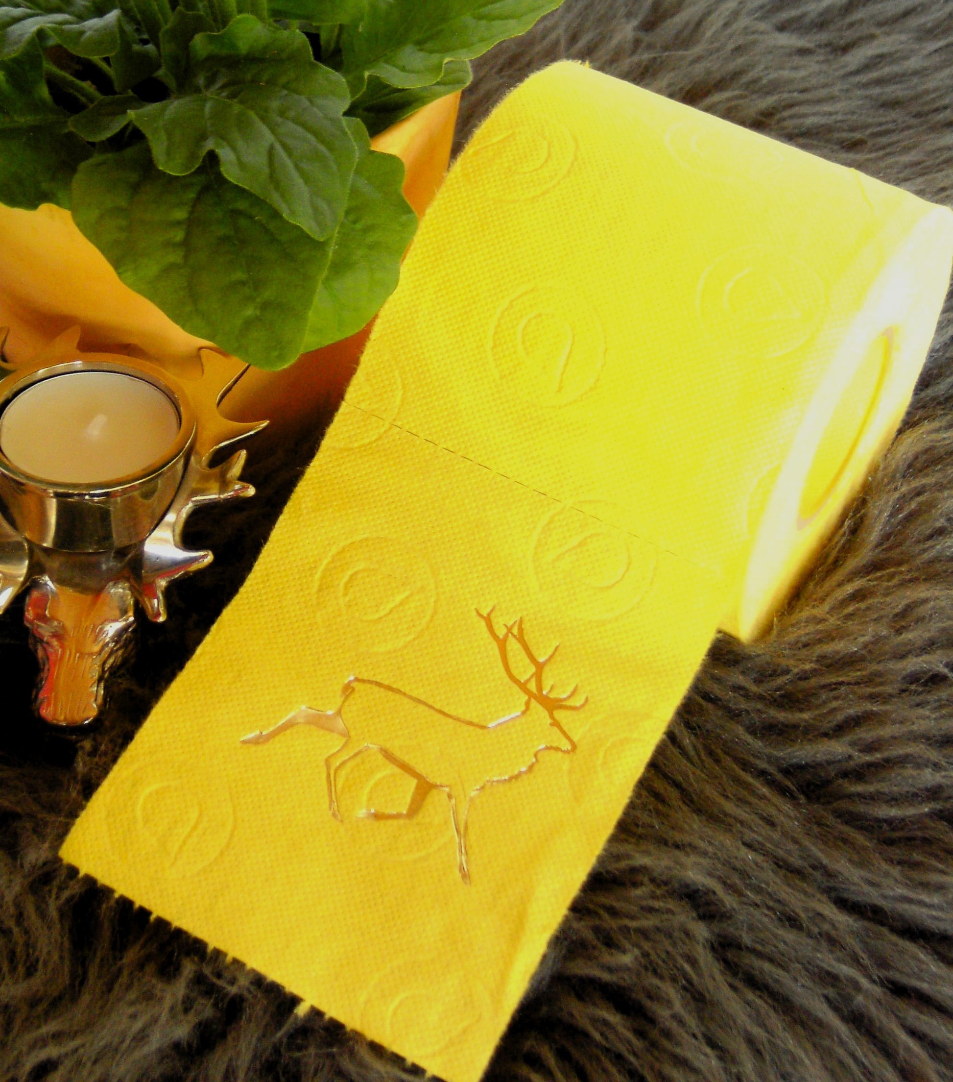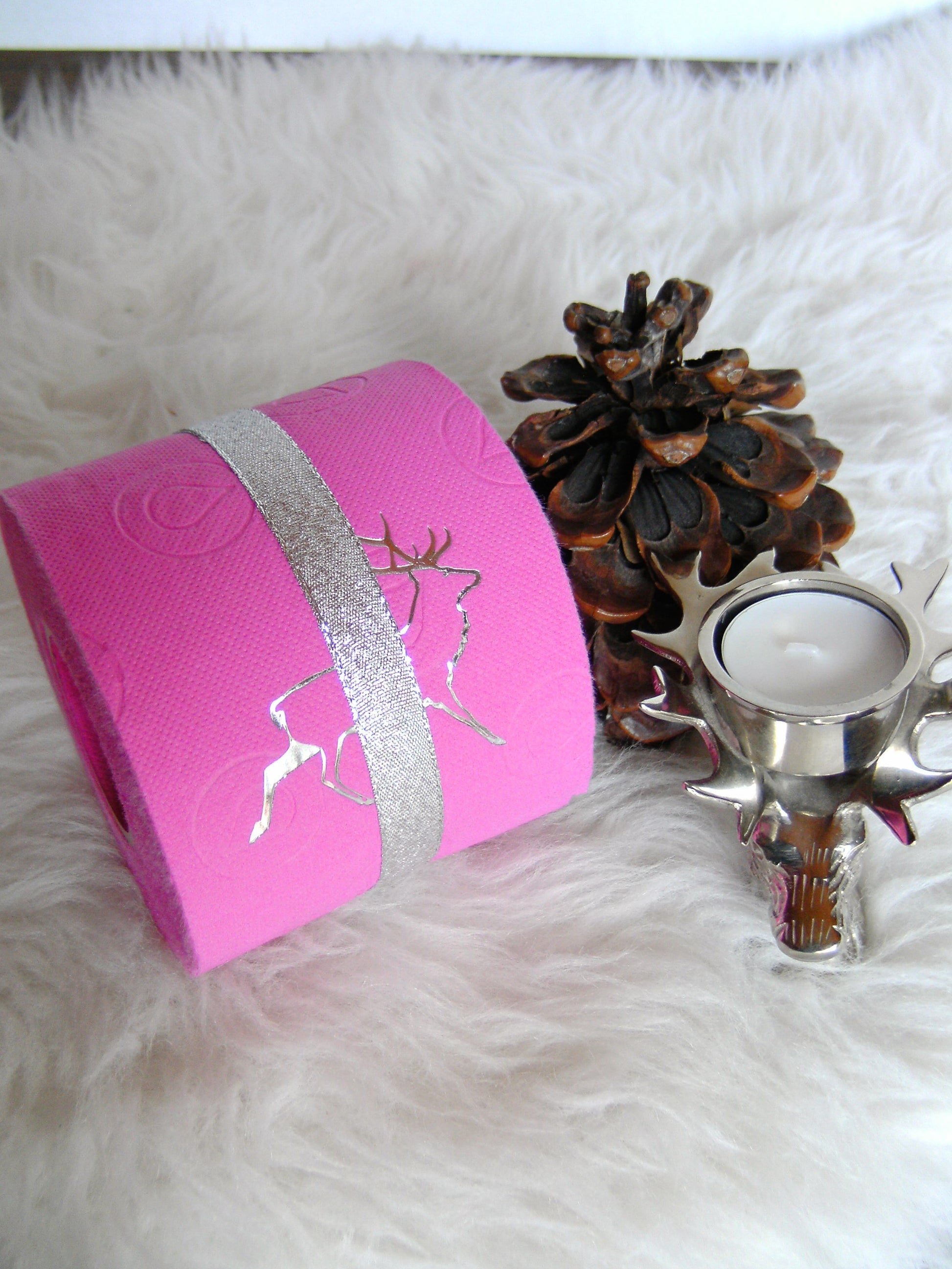 on colored toilet paper. The finely crafted embossing can be found on every second oneLeaf again. During the embossing process, the toilet roll is rolled directly onto an elegant plexiglass core instead of the cardboard core. The roll is then wrapped with a gold or silver ribbon and packed in an organza bag in a matching color. To protect the refined roll, it also comes with an attractive decorative box.