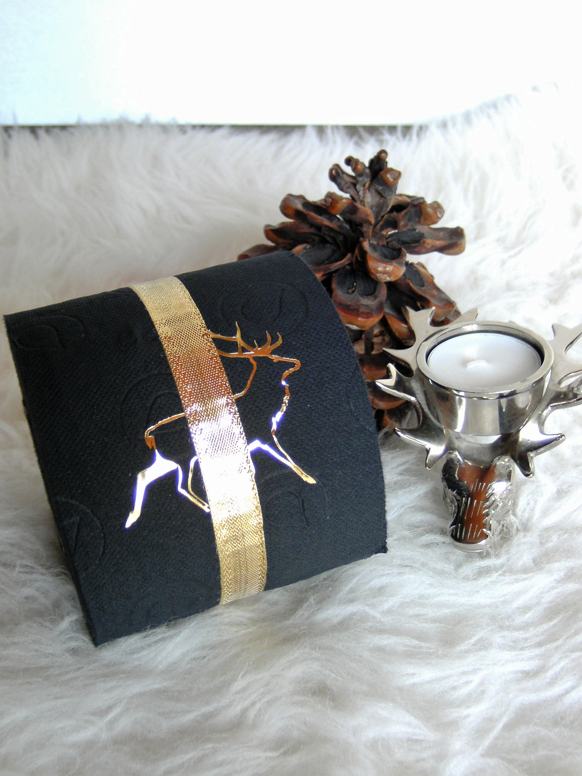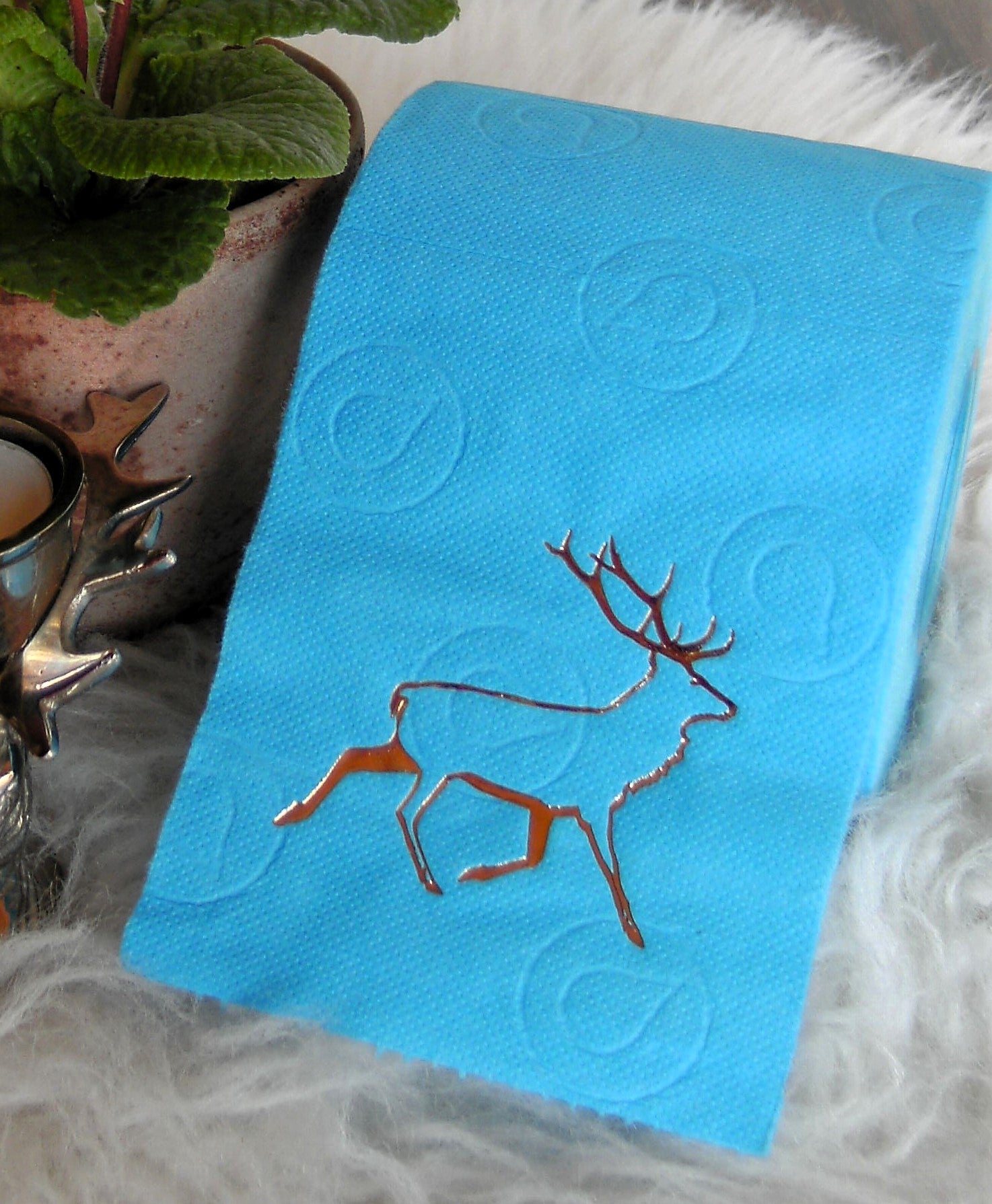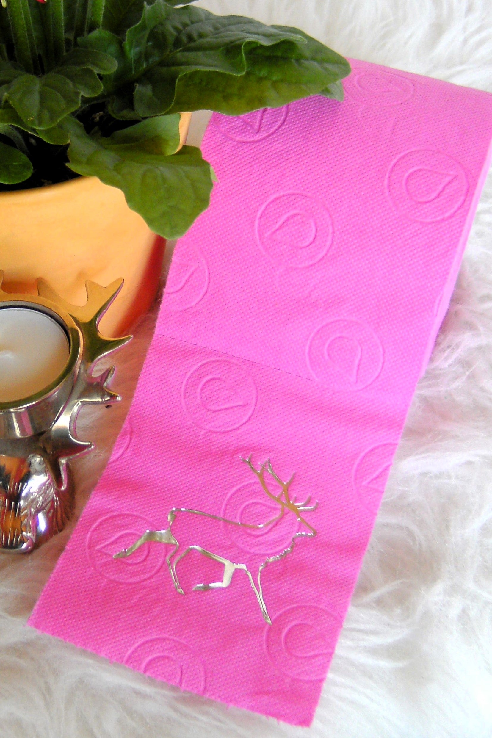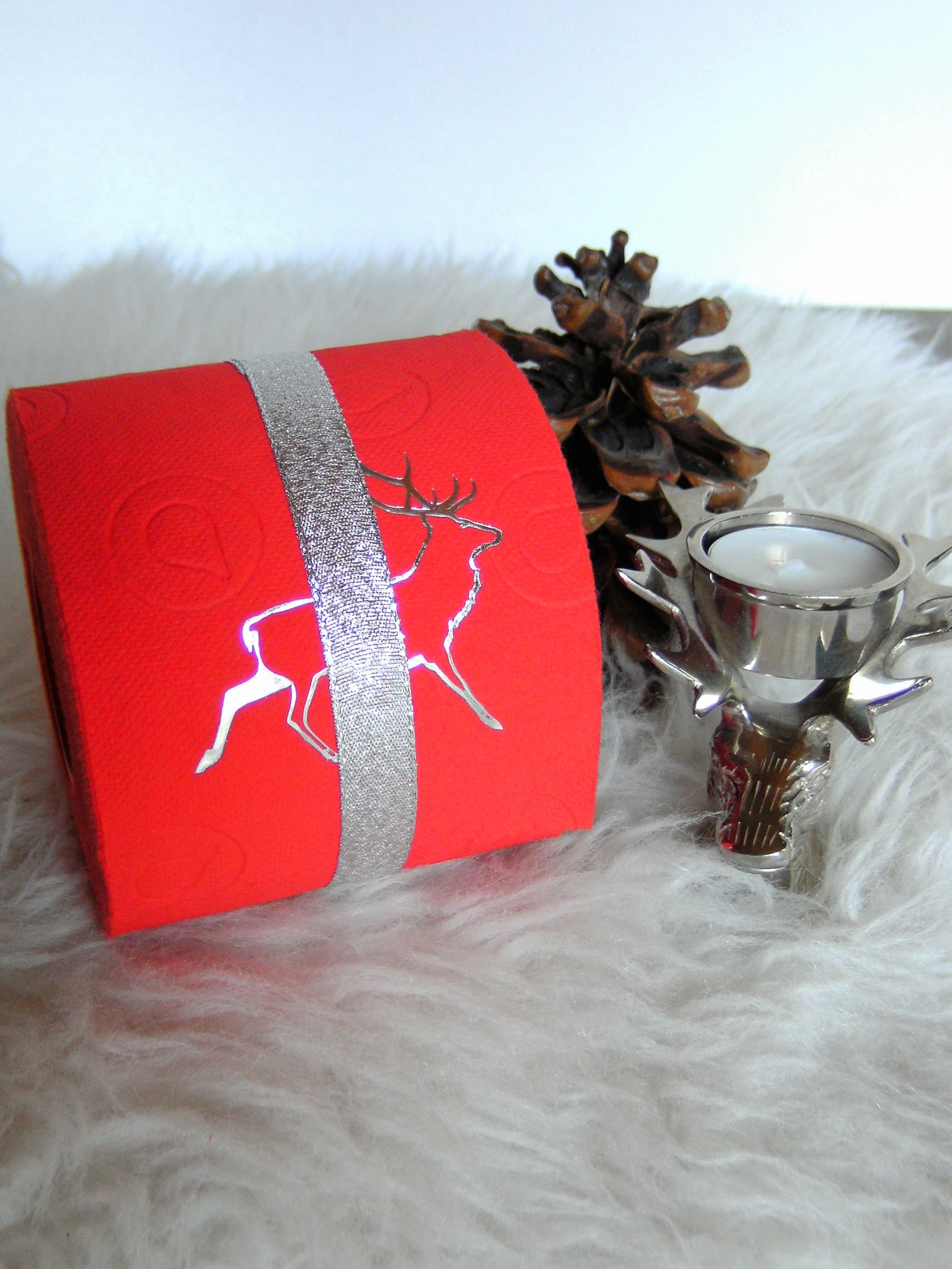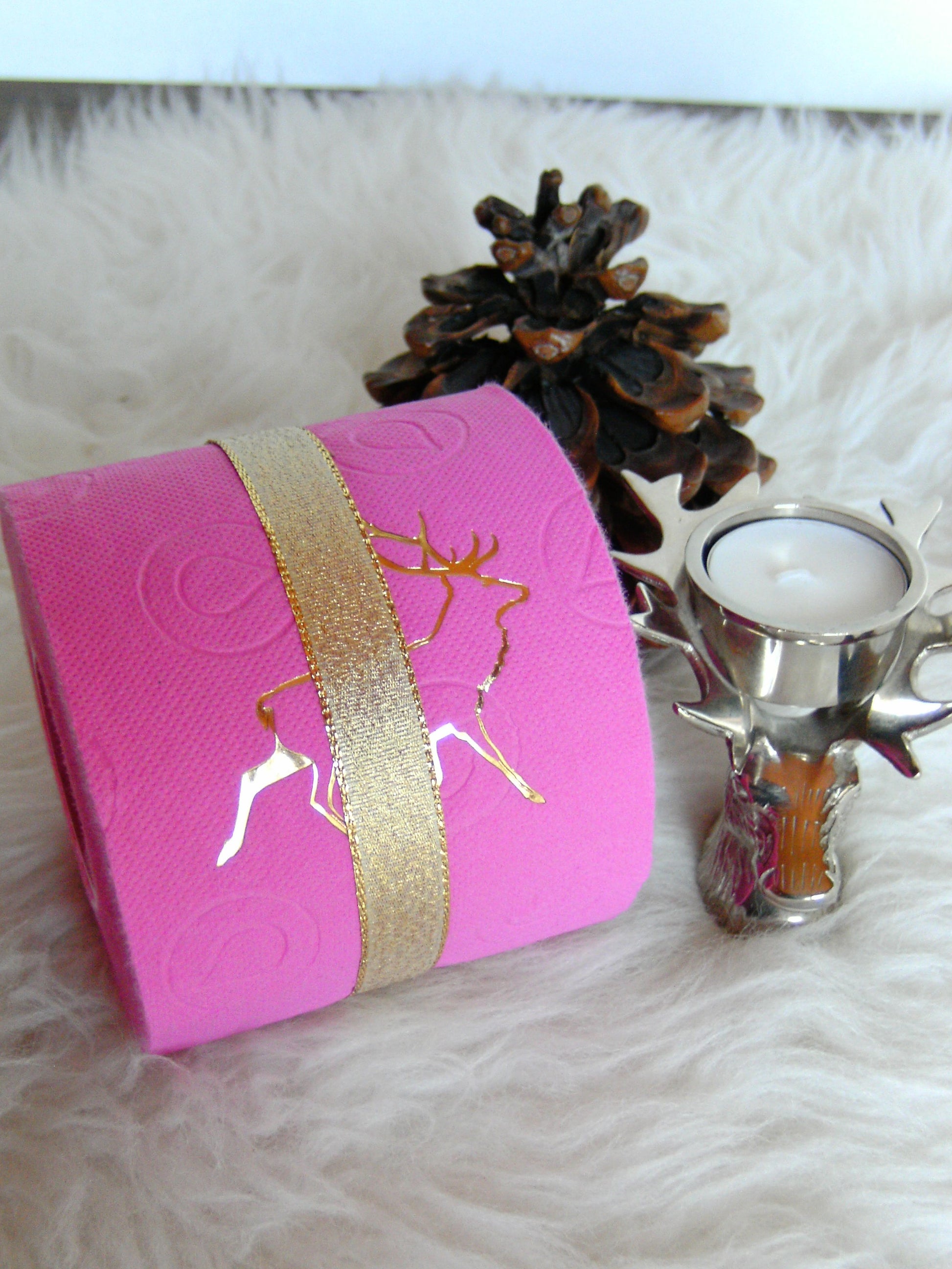 on colored toilet paper. The finely crafted embossing can be found on every second oneLeaf again. During the embossing process, the toilet roll is rolled directly onto an elegant plexiglass core instead of the cardboard core. The roll is then wrapped with a gold or silver ribbon and packed in an organza bag in a matching color. To protect the refined roll, it also comes with an attractive decorative box.