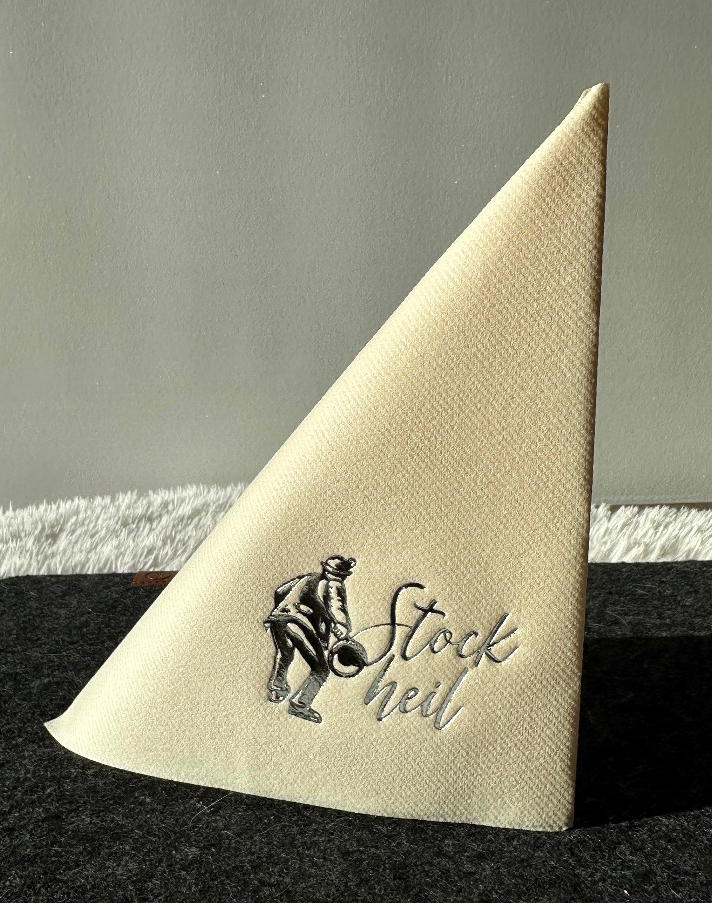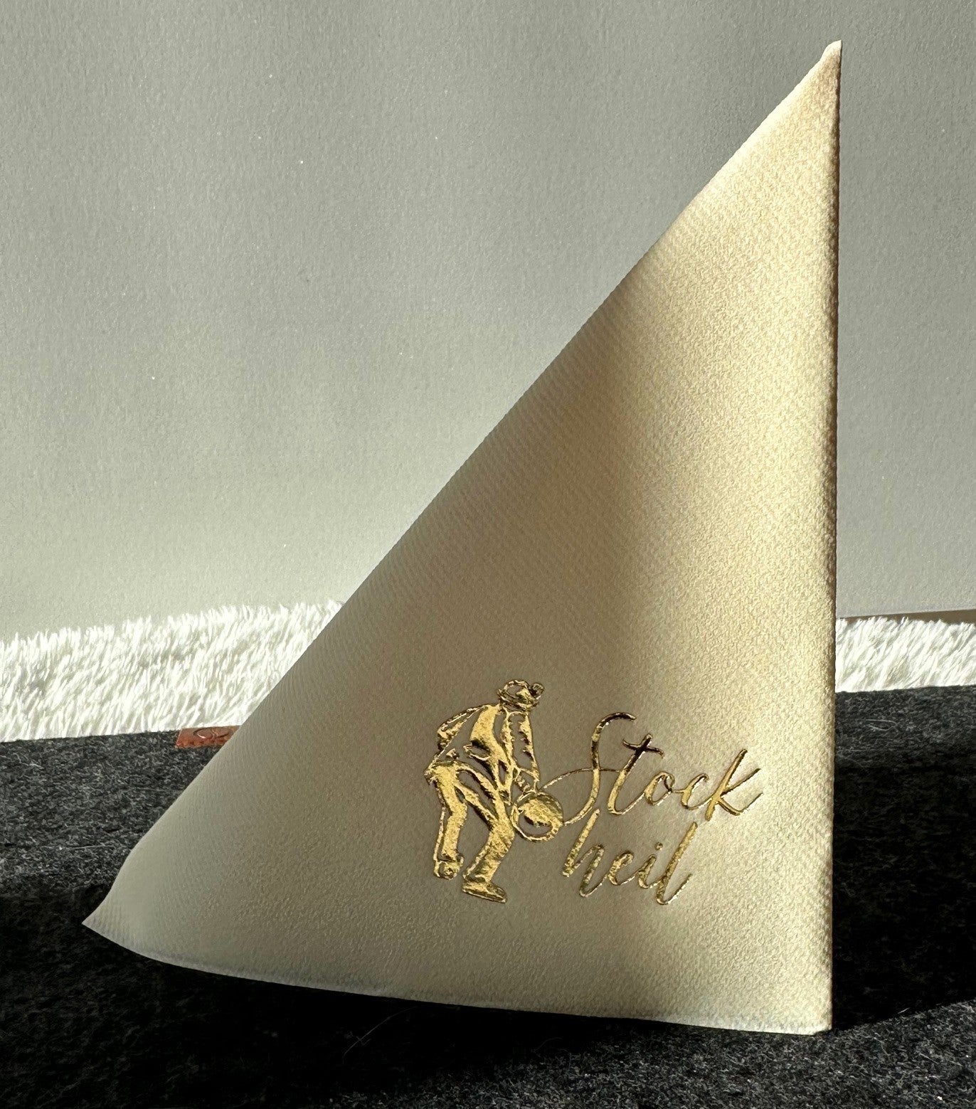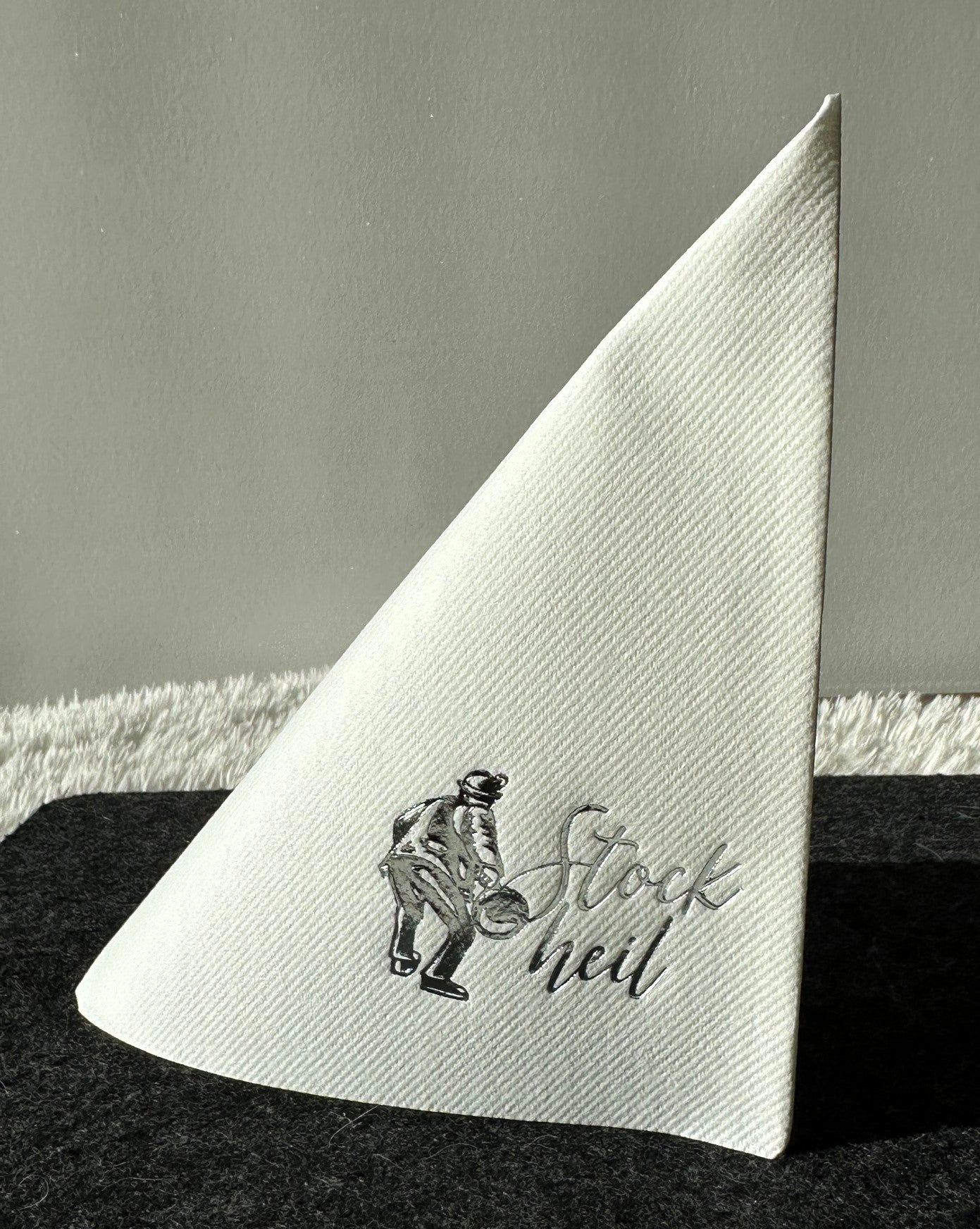 Unsere hochwertigen Airlaid Servietten mit 4/1-Falz verbinden Funktionalität mit stilvoller Optik. Das detailreiche Motiv eines Eisschützen mit Stockheil-Schriftzug wird in feiner Gold- oder Silberprägung aufgebracht und verleiht jeder Veranstaltung einen besonderen Glanz.