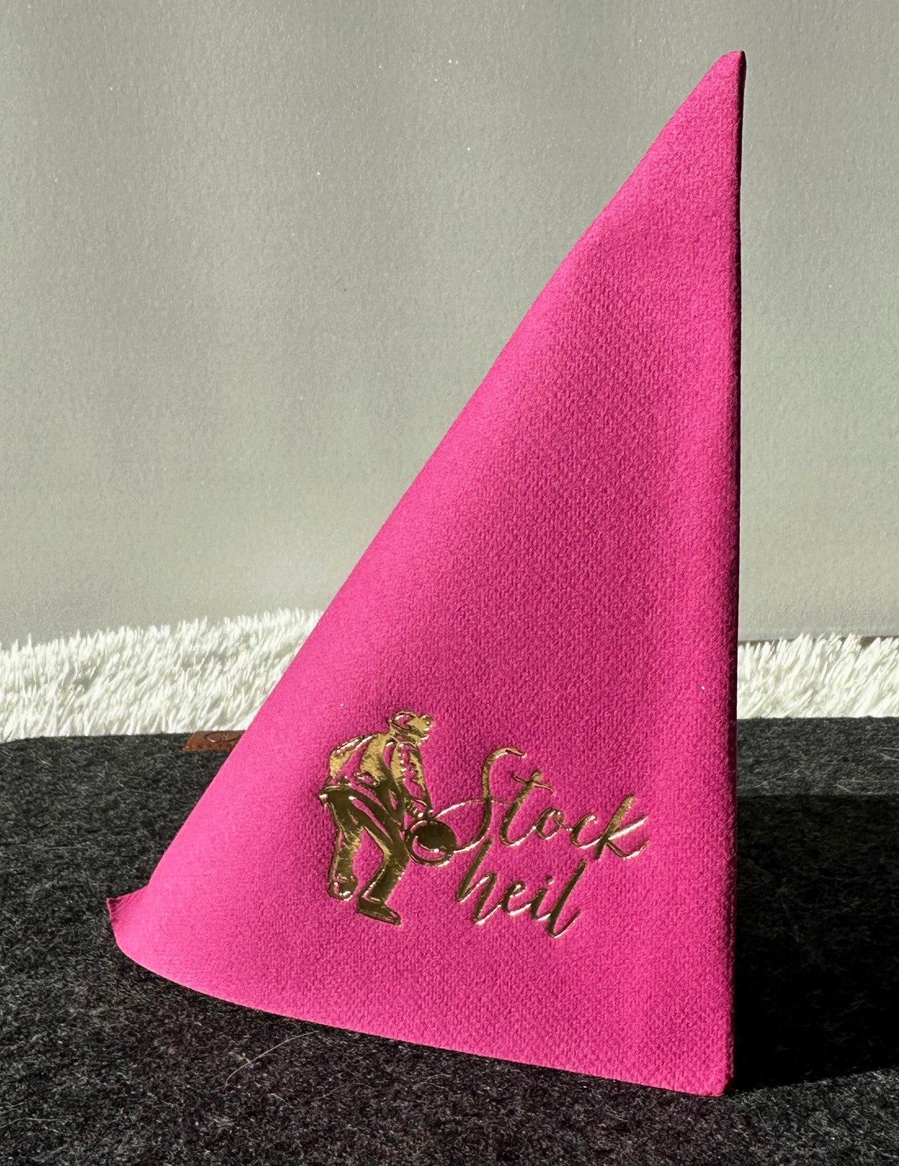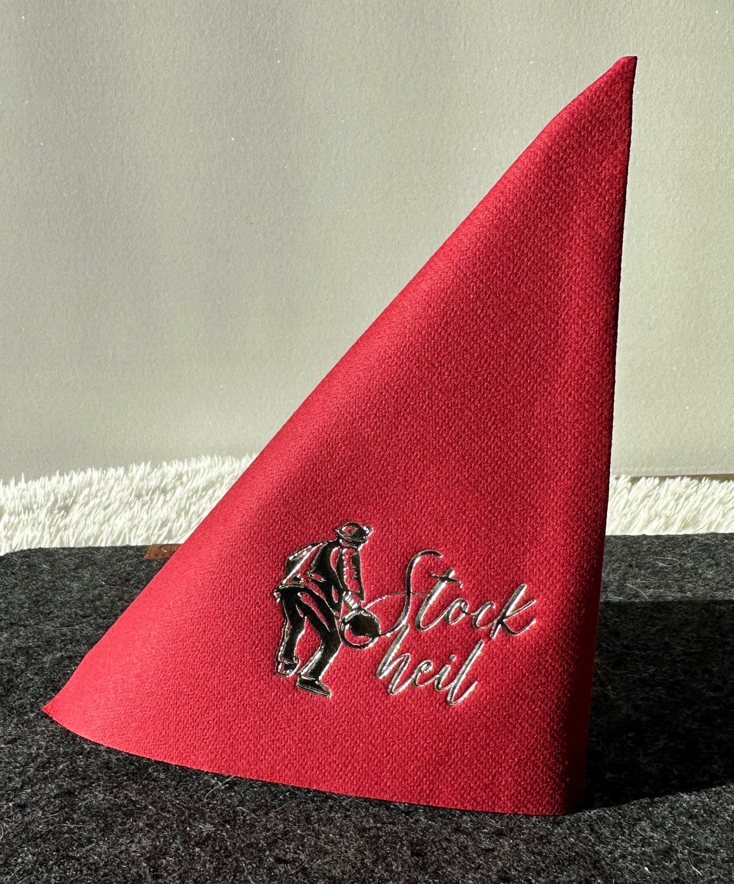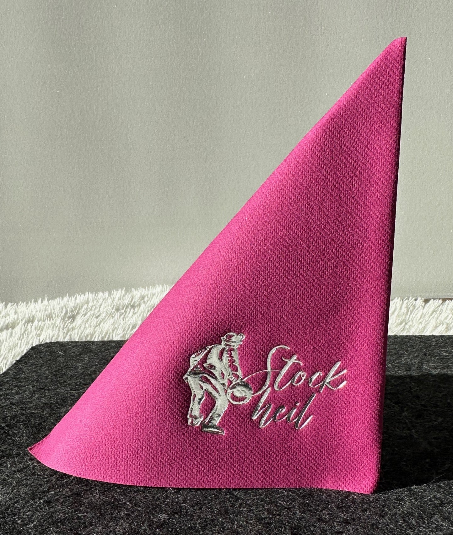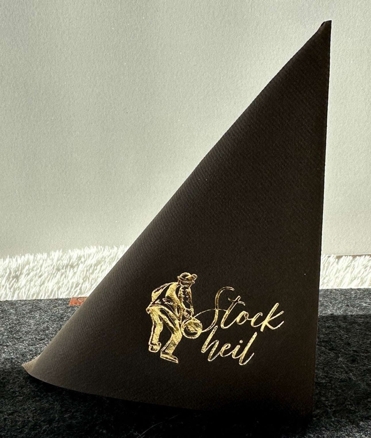 Unsere hochwertigen Airlaid Servietten mit 4/1-Falz verbinden Funktionalität mit stilvoller Optik. Das detailreiche Motiv eines Eisschützen mit Stockheil-Schriftzug wird in feiner Gold- oder Silberprägung aufgebracht und verleiht jeder Veranstaltung einen besonderen Glanz.